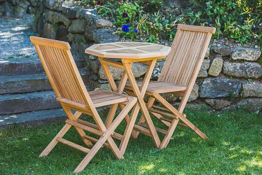 This is a fine 2 seater patio table and chair set, showing off the brilliant quality of our teak patio furniture whilst being exceptionally cost effective. This patio furniture set comprises our excellent 60cm octagonal teak folding patio table alongside 2 of our fantastic solid teak folding patio chairs. Our garden furniture sets give you the opportunity to relax in the summer sun comfortably. The compact nature of this package can add versatility to even the smallest garden or balcony so that you can enjoy the company of your significant other, family member or friend, but additionally these compact patio table and chairs sets are perfectly suited to cafes, pubs, schools, golf clubs and parks.